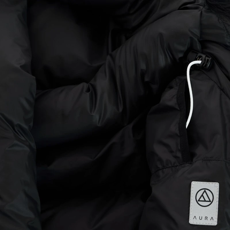 - Deux poches intérieures zippées et une pouvant accueillir les cordons de serrage de la capuche